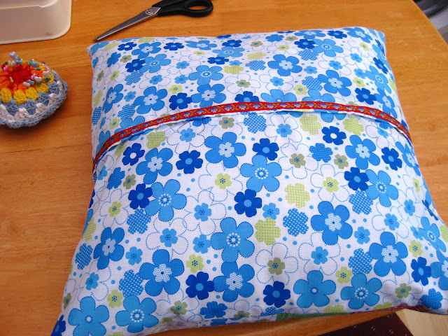 Lucy spotted this gorgeous trim when we met up last month and it's perfect for this project. I also followed her advice in this post and ironed some interfacing onto the back of my cushion front for added strength. It was a big advantage when it came to sewing the two sides together...no seams to get caught up on.........