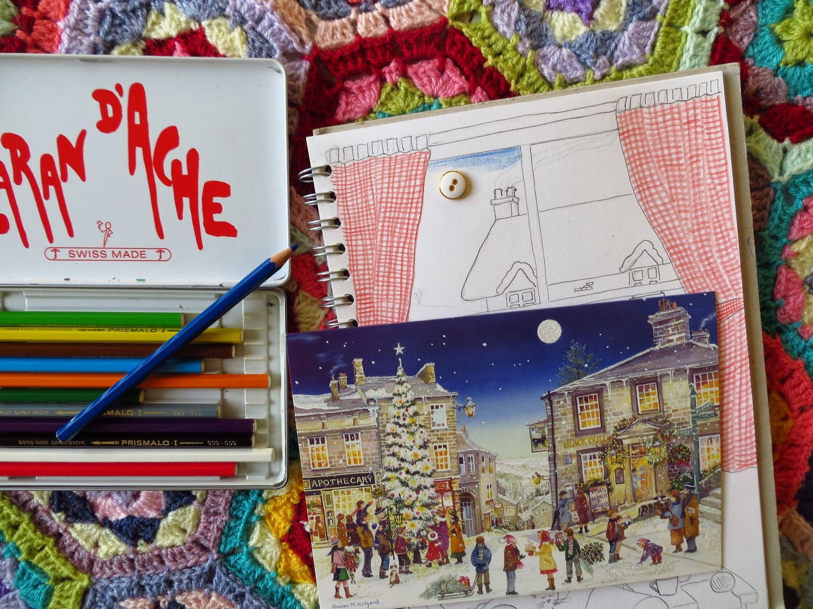 ReplyDeleteYour drawing is (as always!!) beautiful. I like all the little indoor details, and the way that you have included your granny square blanket! Your picture certainly looks cold outside and warm and snuggly inside. xx
