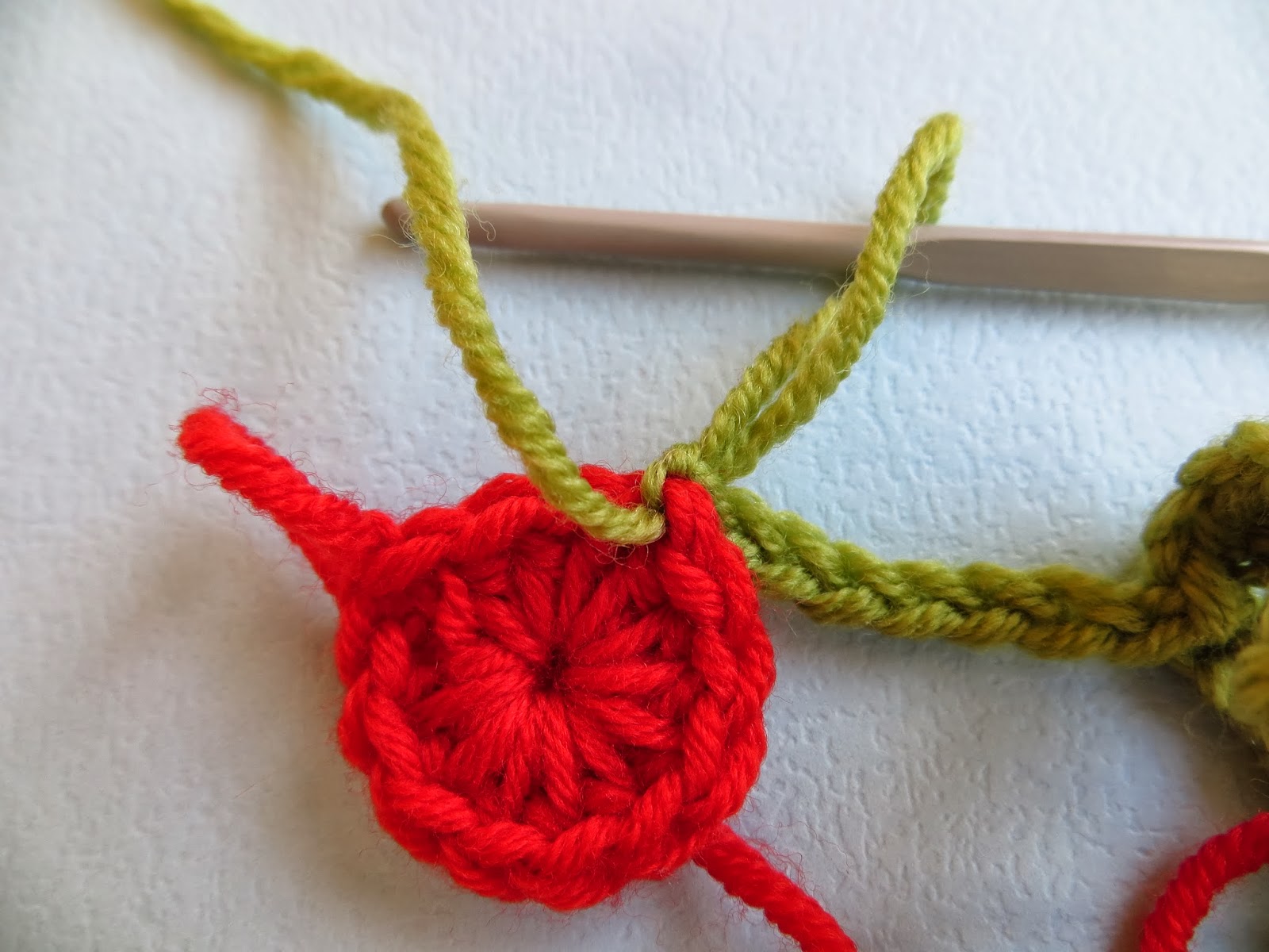 and chain eight to make a stalk. pick up a cherry and insert your hook, from back to front, into any stitch......