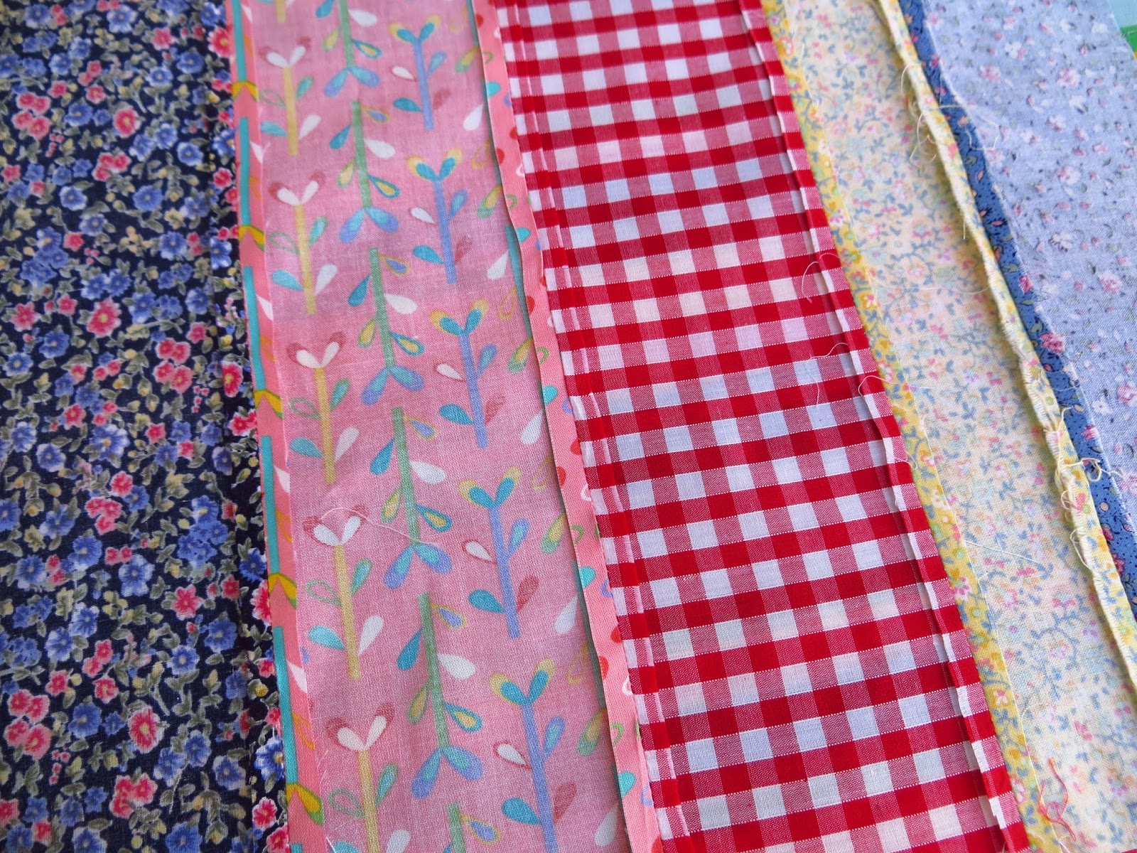 Start by cutting out strips of fabric. Mine are varied widths of between 5 and 10 cm. They are all the same length, 32cm