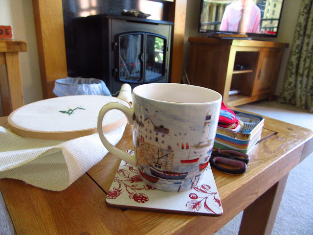 I slept really well in a cool bedroom and woke early to sunshine. How I love being first up and indulging in some holiday craft with a quiet cup of tea. I loved these mugs too.