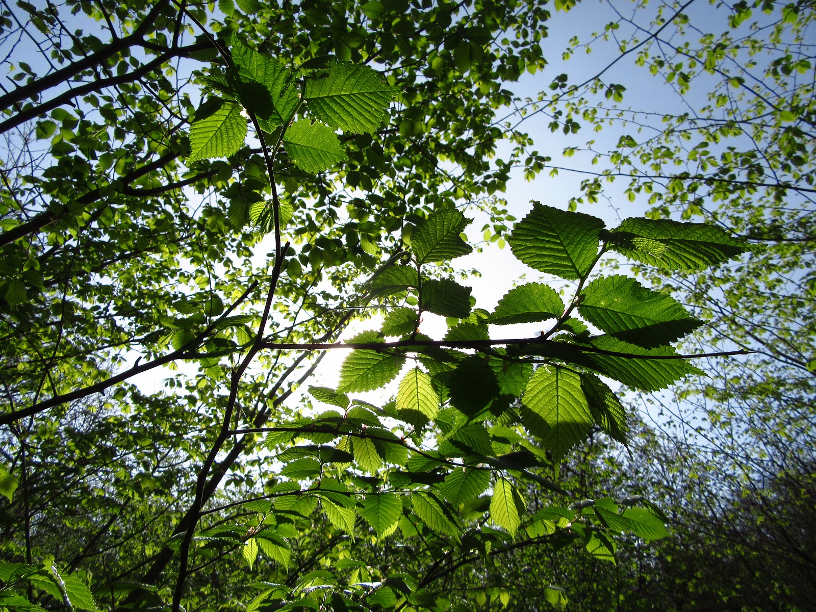 The sunlight made the spring leaves glow.